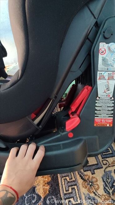 - Montaža u automobil pomoću sigurnosnog pojasa; jasno obeležene smernice za pravilno postavljanje u suprotnom smeru vožnje (0–10 kg) i u smeru vožnje (9–18 kg).