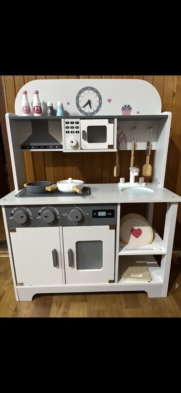 Drvena dečija kuhinja – komplet sa priborom - Dimenzije: 80 cm (visina) x 60 cm (širina) x 26 cm (dubina) - Materijal: drvo, pastelne boje sa detaljima Nova koriscena svega 10 dana razlog prodaje...
