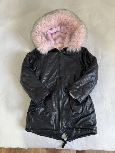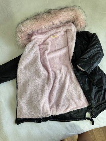 Veštačka kožaZimska jakna za devojčice u crnoj boji, sa roze veštačkim krznom na kapuljači. Postava jakne je od mekog, pufnastog materijala u svetloroze boji, što pruža dodatnu toplinu. Jakna ima patent zatvarač celom dužinom, bočne džepove i učkur za podešavanje struka, omogućavajući udobno pristajanje i zaštitu od hladnoće. Kapuljača je prostrana i obložena istim roze krznom, idealna za hladne dane.