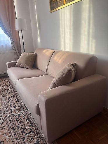 Trosed/klik-klak sofa na rasklapanje - Model: dvosjed sa naslonom koji se obara (klik-klak mehanizam) i pretvara u ležaj - Presvlaka: meka štof/velur tkanina u bež/karamel nijansi, vertikalno proš...