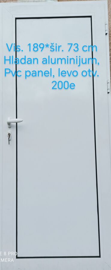 Hladna aluminijumska vrata sa aluminijumskim panelom. Dimenzije: 208 x 95 cm. Desno otvaranje. U kompletu ručka i brava sa ključem. Boja tamno siva/antracit, glatka površina, jednostavan moderan di...