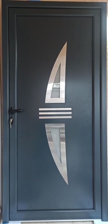 Aluminijumska ulazna vrata – hladan aluminijum sa aluminijumskim panelom. Dimenzije: 208 × 95 cm. Desno otvaranje. U kompletu brava i kvaka sa cilindrom i ključem. Cena: 300 €. Moderne tamnoplave z...