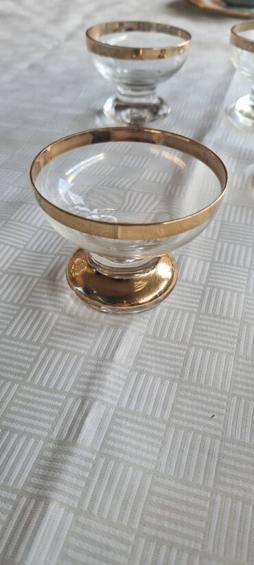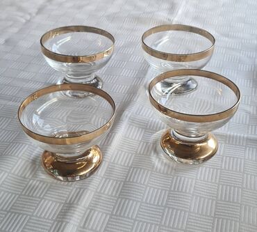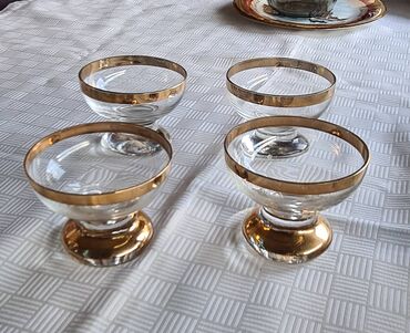 Četiri male čaše sa pozlatom na rubu. Čaše su dosta stare. Mogu da se koriste i za kuglu dve sladoleda. Visina 6 cm, širina 7.5 cm. Cena je zbirna.