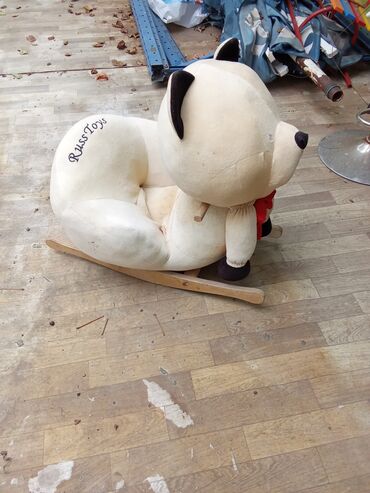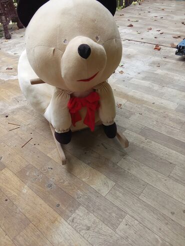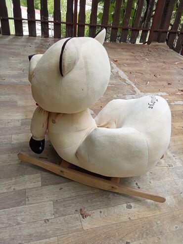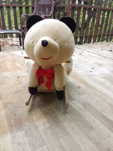 Dečija stolica za ljuljanje u obliku medveda, idealna za igru i opuštanje najmlađih. Izrađena od mekanog plišanog materijala, pruža udobnost i sigurnost. Stabilna drvena osnova obezbeđuje glatko i bezbedno ljuljanje. Dizajn u obliku medveda sa crnim ušima, njuškom i šapama, upotpunjen crvenom mašnom oko vrata, čini ovu stolicu privlačnom i zabavnom. Pogodna za dečije sobe, igraonice ili dnevne boravke.Russ Toys brend.