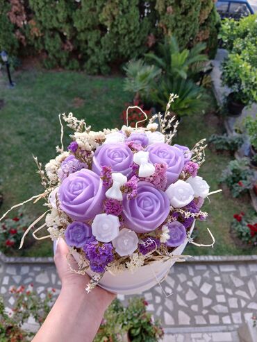 Aranžman od mirisljavih svecau kutiji – ručno rađene cvetne sapunice - Elegantna okrugla poklon-kutija u beloj boji, ukrašena širokom mašnom od tila - Unutra pažljivo složen buket sapunica u oblik...2 500 RSD