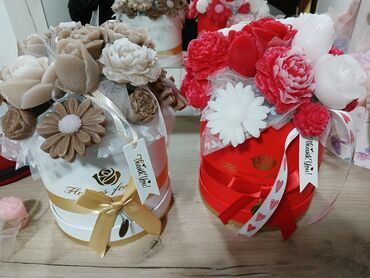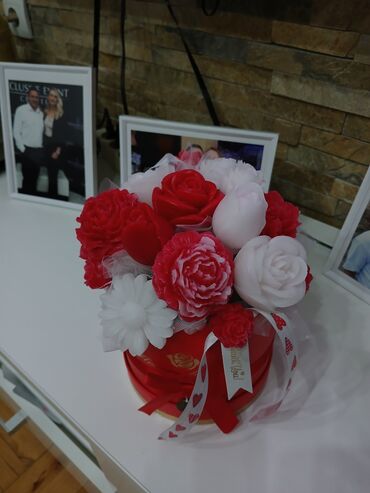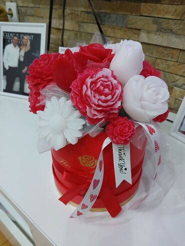 - Unutra pažljivo složen buket cvetova od sapuna: ruže, božuri, lala i poljski cvetići u kombinaciji crvene i bele boje.