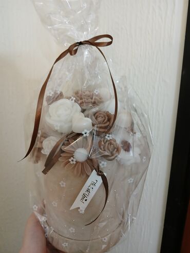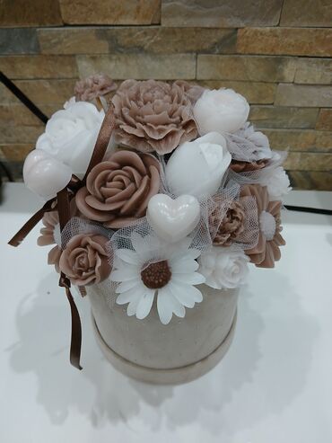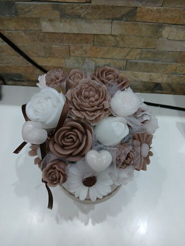 - Ručno rađeni sapuni u obliku cvetova i srca u bež, mlečno beloj i svetlo braon nijansi: ruže, božuri, margarete i pupoljci, ukombinovani sa finom belom mrežicom/tilem.