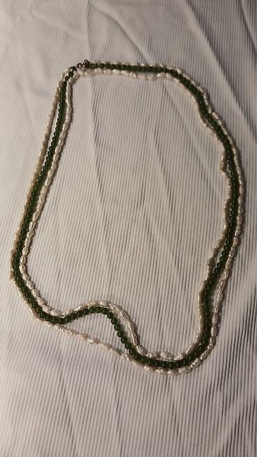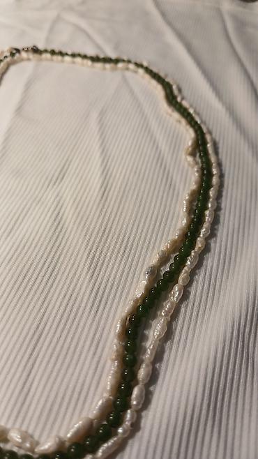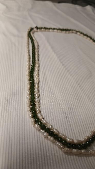 Napomena: Fotografije prikazuju realne boje i raspored perli – beli niz sa blagim sedefastim sjajem i centralni zeleni niz za izražen kontrast. Idealno kao istaknuti dodatak ili kao suptilan akcenat preko jednostavnih bluza i haljina.