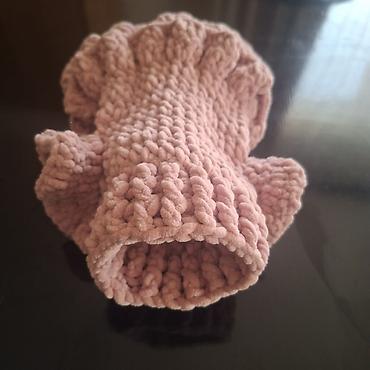 Džemperak za psa – ručno pleten, nežno ružičaste boje, od meke, plišane pređe. Topao i udoban, sa elastičnim ovratnikom za lako oblačenje. Dekorativni volani duž leđa i oko nogu daju poseban, elegantan izgled.