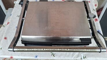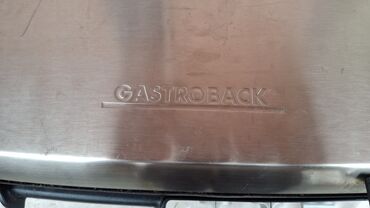 Robusan kuhinjski aparat za brzu pripremu obroka sa preciznom kontrolom vremena i temperature. Marka: Gastroback (natpis na poklopcu). Tekst na prednjoj prečki: „Open BBQ Grill • Contact Grill • Sandwich Press“. Kabel za napajanje uključen.