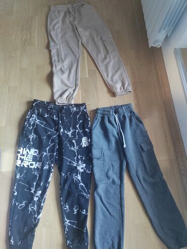 Komplet trenerki – 3 para donjih delova: Krem sa dzepovima deblji pamuk S, crno- sivd Kropp odgovaraju za ženski M, naznačena S i sive deblji pamuk M sa dzepovima. Sva tri para su nošena u zadovoljavajućem su stanju 750 din za komplet.