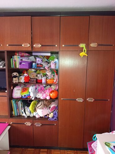 Veliki modularni plakar/sekciona biblioteka za dečiju ili dnevnu sobu, u drvenom dekoru tamnog oraha.