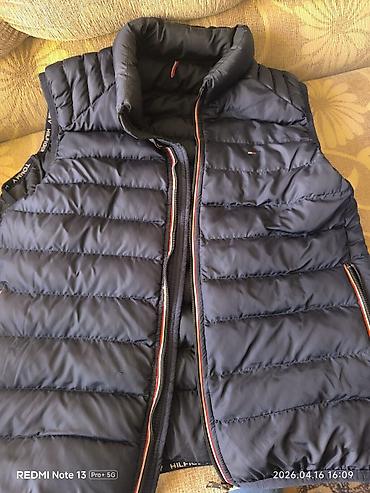 - Plišani/pufer prsluk tamnoplave boje (Tommy Hilfiger detalji): horizontalno prošiven, visok kragnu, rajsferšlus sa trikolor ivicom, dva bočna džepa sa zipom, diskretan mini logo na grudima i brendirana traka sa unutrašnje strane rukavnih izreza. Lagan i topao sloj za prelazne dane.