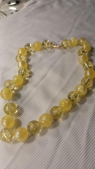 - Elegantna ogrlica sastavljena od okruglih perli u dve nijanse: providno limun-žuto i mlečno žuto.