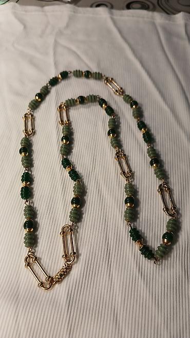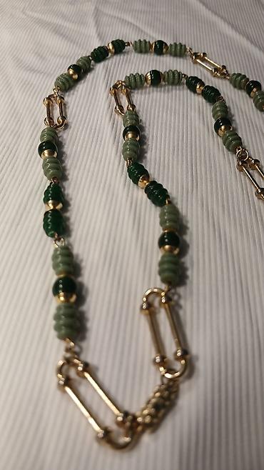 - Elegantna duga ogrlica izrađena od niza zelenih perli u dve nijanse (tamnozelena i svetlozelena), kombinovanih sa sitnim metalnim kuglicama u zlatnoj boji.