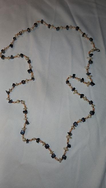 Ogrlica sa velikim fasetiranim perlama u metalik antracit/hematit nijansi. Perle su nanizane u segmentima povezanim tamnom, čvrstom karikom/lancom, što daje izražen, efektnan izgled. Na jednom kraj...
