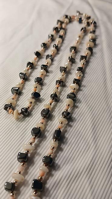 - Ručno nizan dugi lanac u kontrastu crno–krem tonova: glatke tamne perle (hematit-efekat) kombinovane sa kremastim čips perlama i sitnim bledoružičastim i zlatnim međuperlama. Dinamična tekstura i sjaj tamnih elemenata naglašeni su toplim zlatnim detaljima.