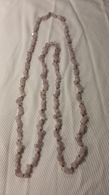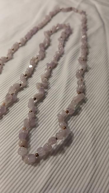 - Ručno nizan dugi lanac sa nepravilnim perlama od svetloružičastog kamena (izgleda kao ružičasti kvarc) raspoređenim uz sitne metalne zlatne perlice. Pastelna, nežna nijansa daje suptilan sjaj i lako se uklapa uz svakodnevne i svečane kombinacije. Može se nositi jednostruko kao duga ogrlica ili obmotati u dva reda za slojevit izgled.