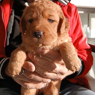 - Više štenaca toplih zlatnih/riđih nijansi, kratke do poluduge dlake