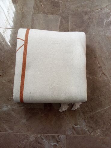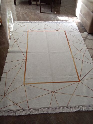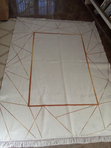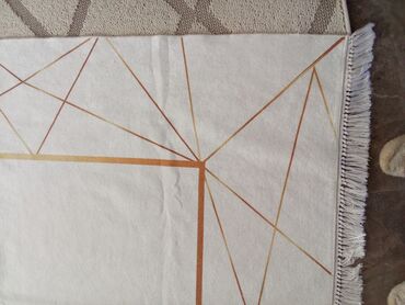 - Boja: svetlo bež/ekru podloga sa linijama u nijansama bakarno‑zlatne (ombre efekat), ukrasne rese na kraćim stranama