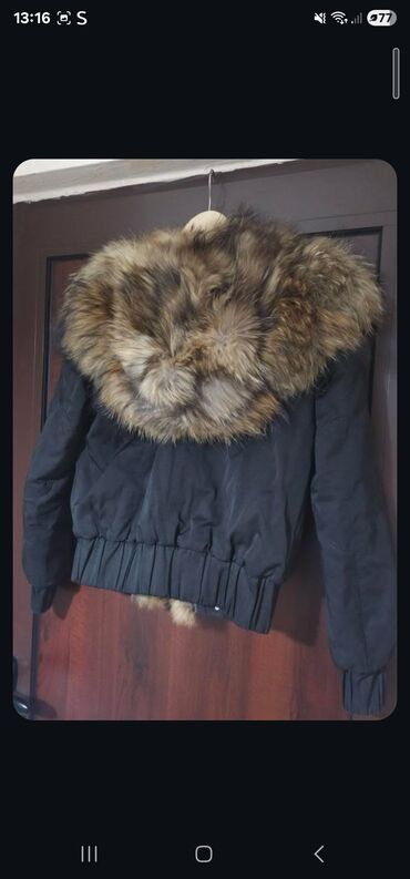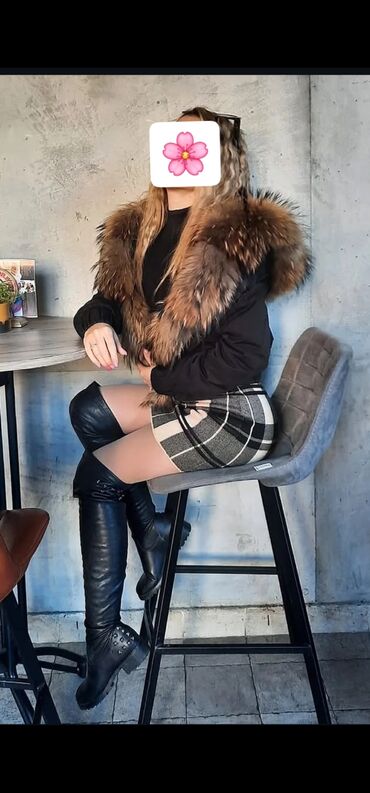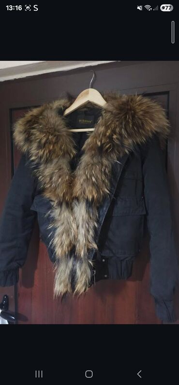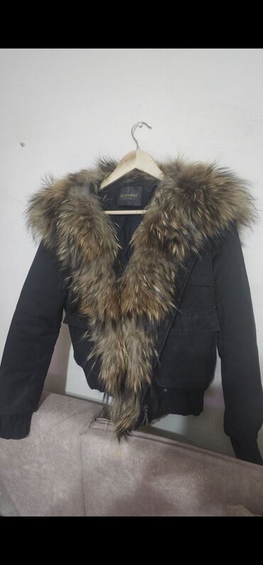 Ženska kraća jakna sa raskošnim krznenim okovratnikom, vodootporna bez ostecenja. Punjena perjem, pretopla. Krzno moze i da se skida. placena 35.000