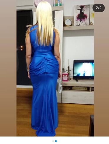 - Fason: uska silueta koja prati liniju tela, sa asimetričnim prednjim delom i visokim šlicem sa strane; duži zadnji deo formira diskretan šlep.