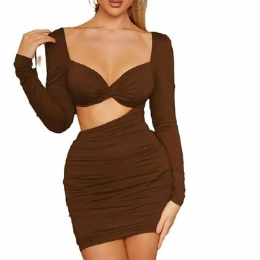 - Detalji: asimetričan cut-out na struku, drapirani/požužvani efekat po celoj haljini, uvrnuti prednji deo preko grudi