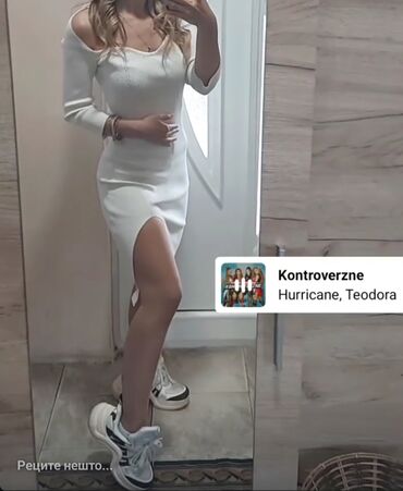 Uska ženska pletena haljina, midi dužine, u belo-krem nijansi. Model je pripijene siluete sa spuštenim ramenima i 3/4 rukavima. Materijal je rebrasti trikotaž koji prati liniju tela. Na levoj strani nalazi se visoki bočni šlic do sredine butine, koji olakšava kretanje i daje elegantan izgled. Haljina ima blago zaobljen dekolte i ravne ivice. Idealna za kombinovanje sa patikama ili čizmama za casual-chic stil, kao i sa štiklama za večernji izlazak.