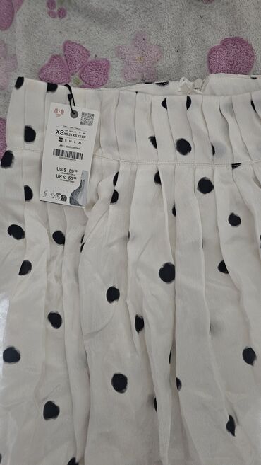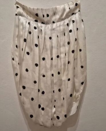 Bela plisirana suknja sa crnim tufnama - Model: midi/koleno dužina, blago balon kroj pri dnu - Print: klasične crne tufne na beloj podlozi - Detalji kroja: široki nabori od struka nadole, formiran...