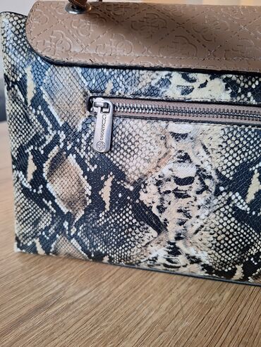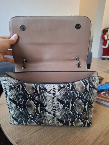 - Telo torbe u printu zmijske kože (crno‑bež), efektna tekstura