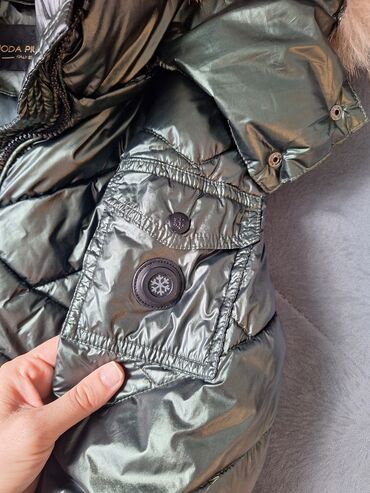 - Kapuljača sa bogatim krznom; kapuljača i krzno izgledaju skidivo (dugmad i rajsferšlus)