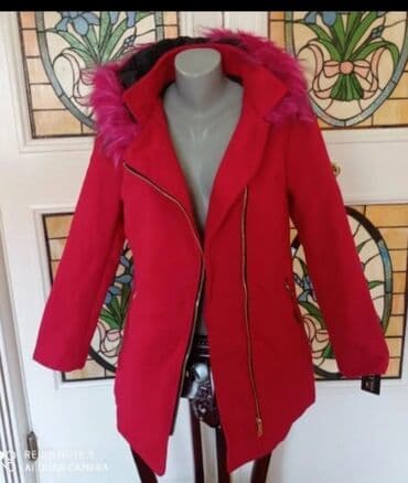 Ženska zimska jakna/kaput u intenzivno crvenoj boji sa kapuljačom. Kapuljača je obložena krznenim detaljem u ružičastoj nijansi, a unutrašnjost izgleda postavljena za dodatnu toplinu. Asimetrično k...