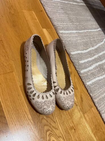 Ženske baletanke – bež/svetlosive - Materijal: meka koža (gornjište), kožna ili kožnata postava i uložak - Dizajn: izrezani perforirani detalji oko ruba i sa strane; utisnuti cvetni ornamenti na v...