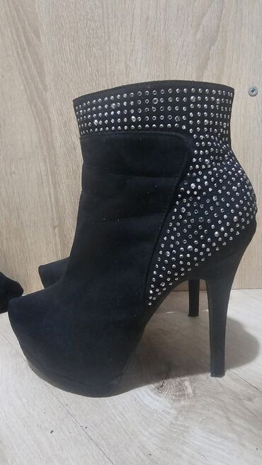 Crne ženske ankle čizme na visoku štiklu sa platformom. Gornjište od mekog materijala na dodir (efekat antilopa), ukrašeno sjajnim metalnim nitnama/kamenčićima oko gornjeg ruba i pozadi na peti za glamurozan izgled. Uski kroj oko zgloba ističe siluetu stopala. Visoka tanka potpetica i skrivena prednja platforma pružaju dodatnu visinu uz stabilniji oslonac. Zatvaranje sa unutrašnje strane nije vidljivo na fotografijama. Elegantne čizme idealne za večernje izlaske, svečane prilike i kombinovanje sa haljinama ili uskim pantalonama. Color: crna. Stil: glam/party.