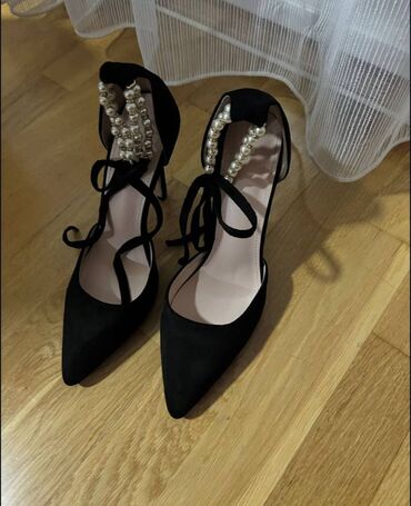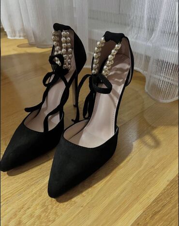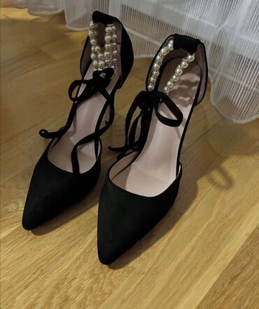 Elegantne crne salonke/štikle sa vezivanjem oko zgloba i ukrasnim bisernim narukvicama na risu. - Materijal: meka eko antilop tkanina spolja, glatka bež postava. - Oblik: špicasti vrh, zatvoren...
