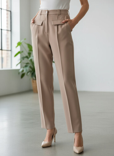 Elegantne pantalone u bež/kašmir nijansi - Klasican, ravan kroj sa blago užim nogavicama - Diskretan nabor i preklop napred - Džepovi sa strane - Petlja za kaiš duž celog struka - Skriveno kopčanj...