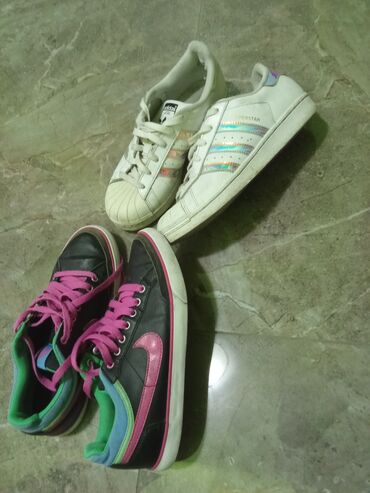 - Dve bele patike u stilu Adidas Superstar, sa školjkastim vrhom i sjajnim/prizmatičnim prugama sa strane, pertle bele.