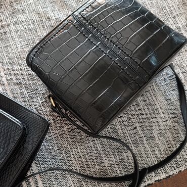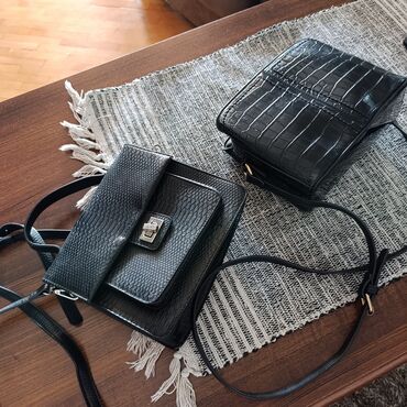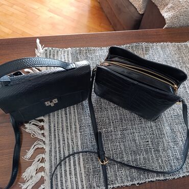 Veštačka kožaDve elegantne ženske torbe preko ramena – crna imitacija krokodilske/zmijske kože.