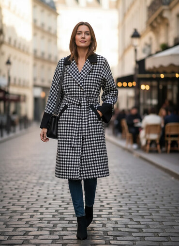 Ženska elegantna kaput-jakna u svetlosivoj boji sa modernim detaljima: - Asimetrično preklapanje napred sa kosim, vidljivim rajsfešlusom u crnoj boji - Široka, mekana kragna koja se može nositi spu...