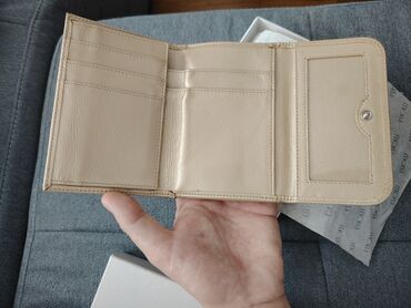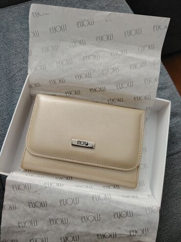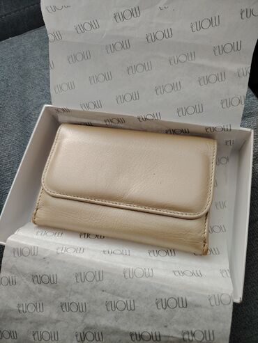 Mona kožni novčanik manjih dimenzija, bež boje sa više pregrada i zadžepaka. Ima blagi sjaj. Prodajem ga jer mi je rečeno da je nov, a nije. Kao nov je zapravo, ali na uglovima se vrlo malo vidi da je skinuta boja što sam i prikazala na fotografijama. Dolazi u kutiji i foliji.