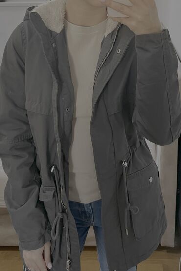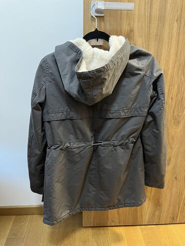 Ženska zimska jakna sa kapuljačom i prirodnim krznom lisice na obodu. - Boja: svetla/bež nijansa spolja, topla bež postava - Materijali: spolja mekani velur/antilop izgled; unutrašnjost plišasto t...