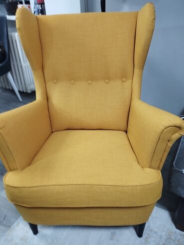 Fotelja sa visokim naslonom i “wingback” bočnim krilima, u žutoj boji.