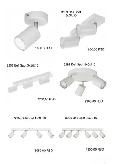 Bela1. 3197 Crna GU10 Spot Lampa 1 Svetlo Dimenzije: [ L: 54 x H: 75 mm] Jednostavna i moderna spot lampa za diskretno osvetljenje vašeg prostora. Cena: 1000 RSD 2. 3199 Crna GU10 Spot Lampa 2 Svetla Dimenzije: [L: 199 x W: 144 x H: 199 mm ] Praktična dvostruka lampa za ravnomerno osvetljenje i stil. Cena: 1800 RSD 3. 3206 Crna GU10 Spot Lampa 3 Svetla Dimenzije: [ L: 400 x W: 61 x H: 140 mm] Trostruka lampa koja osvetljava veće prostore uz moderan izgled. Cena: 2700 RSD 4. 3292 Crna GU10 Spot Lampa Rotirajuća 3 Svetla Dimenzije: [Ø200 x H: 85 mm ] Rotirajuća lampa za fleksibilno i precizno osvetljenje. Cena: 2900 RSD 5. 3296 Crna GU10 Spot Lampa 6 Svetala Dimenzije: [ ] Idealno rešenje za maksimalno osvetljenje u bilo kom prostoru. Cena: 4900 RSD 6. 3294 Crna GU10 Spot Lampa 4 Svetla Dimenzije: [ L: 550 x W: 60 x H: 250 mm] Četvorostruka lampa za moderan akcenat i optimalno osvetljenje. Cena: 3950 RSD GARANCIJA 2 GODINE> < VAŽI ZA SVE MODELE: ip grla: GU10 Broj grla: 1-6 Ready for LED: DA Boja: Bela Radni napon: 230V Izvor svetla: GU10 max.50W Sij. uključene uz proizvod: NE IP zaštita: IP20 Stepen električne zaštite: I klasa Temperatura okoline: 0~ +40 ° C Način montaže: Na plafon Dimabilnost: OPCIONO