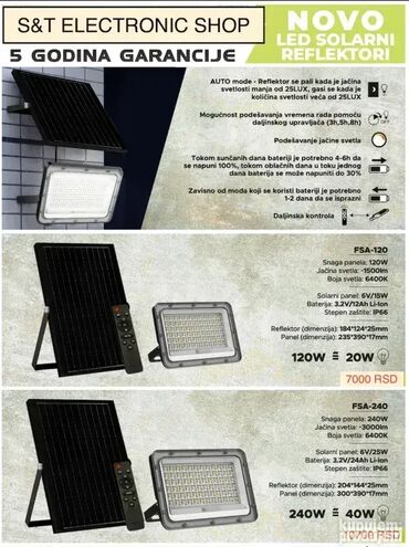 • 120W Snaga: Obezbeđuje jako i svetlo osvetljenje. • 1500 Lumena: Visoka osvetljenost za maksimalnu vidljivost. • Solarno napajanje: Nema potrebe za kablovima – pokreće ga6V/15W solarni panel sa 3.2V/12Ah Li-Ion baterijom za pouzdan rad. • Daljinski upravljač: Lako podešavanje iz daljine. • Vodootpornost (IP66): Dizajniran da izdrži kišu i nepovoljne spoljne uslove. • Hladno belo svetlo (6400K): Omogućava čisto i prirodno osvetljenje. • Izdržljiva konstrukcija: Dimenzije reflektora: 184x124x25 mm , dimenzije panela: 235x390x17 mm.