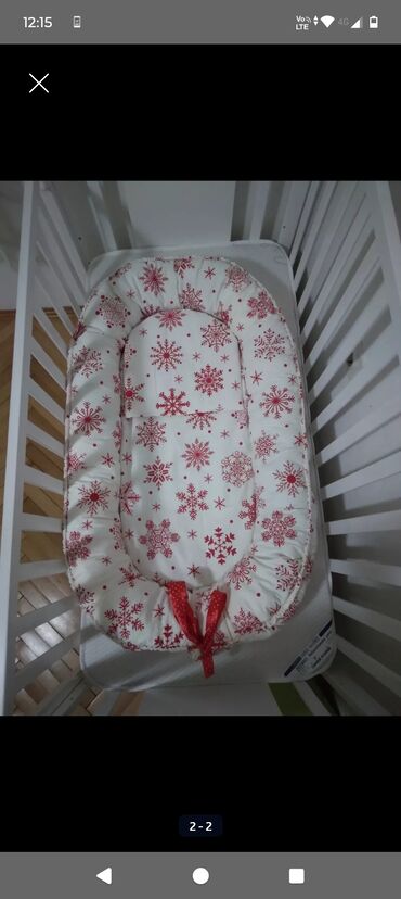 - Materijal: pamučna navlaka sa printom crvenih pahulja na beloj podlozi; mekan punjeni rub koji bebi daje osećaj ušuškanosti.