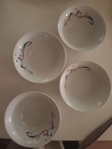 Apulina Set porcelanskih činijica – 4 komada - Materijal: porcelan (žig sa krunom na dnu) - Boja: bela sa dekorom u crvenim i zelenim linijama/tačkicama - Oblik: okrugle, blago dublje posudice - N...