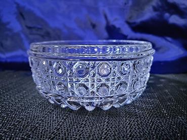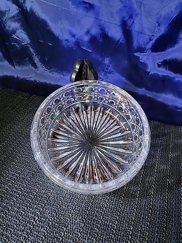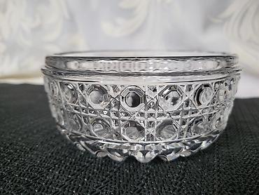 Kristalna bombonjera sa poklopcem na postolju - Materijal: kristalno staklo (nalepnica “CRYSTAL 24% PbO”) - Dizajn: reljefni cvetni motivi po celoj površini; fasetirani rubovi za snažan lom svetlo...
