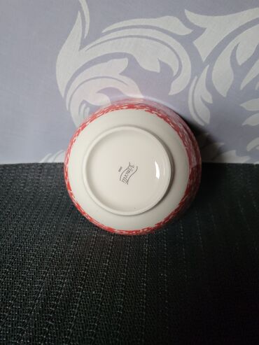 Apulina Set porcelanskih činijica – 4 komada - Materijal: porcelan (žig sa krunom na dnu) - Boja: bela sa dekorom u crvenim i zelenim linijama/tačkicama - Oblik: okrugle, blago dublje posudice - N...