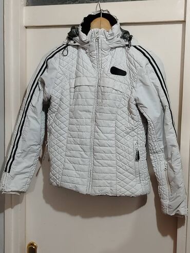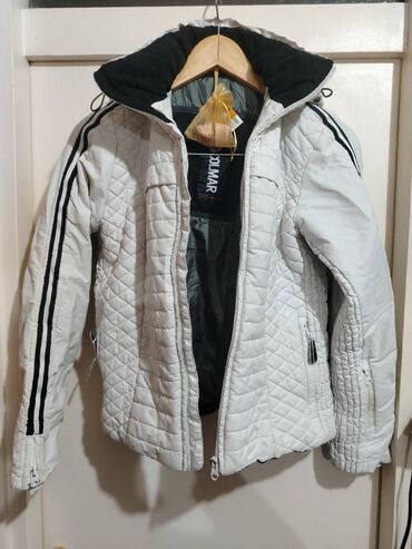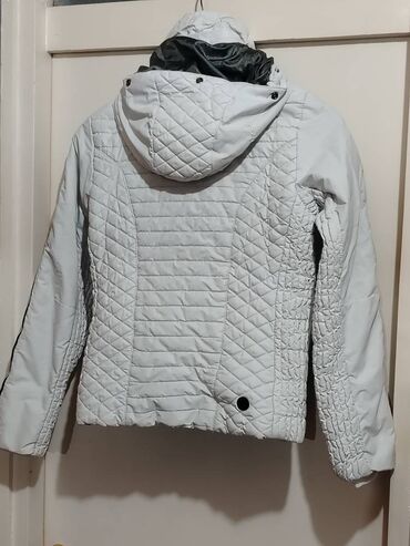 Zimske jakne – komplet - Bela prošivena ženska jakna do sredine butine, duplo kopčanje (dugmad), širok rever obložen sivim veštačkim krznom. Dva velika prednja džepa sa dugmetom. Topla, sa dezenir...