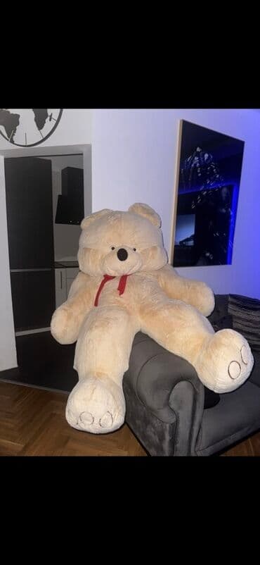 Ogromni plišani meda – krem boje, sa crvenom mašnom. - Veličina: džinovski format, dužina približno od poda do vrha naslona troseda (pogodno kao dekoracija ili za maženje). - Materijal: mekani, ne...